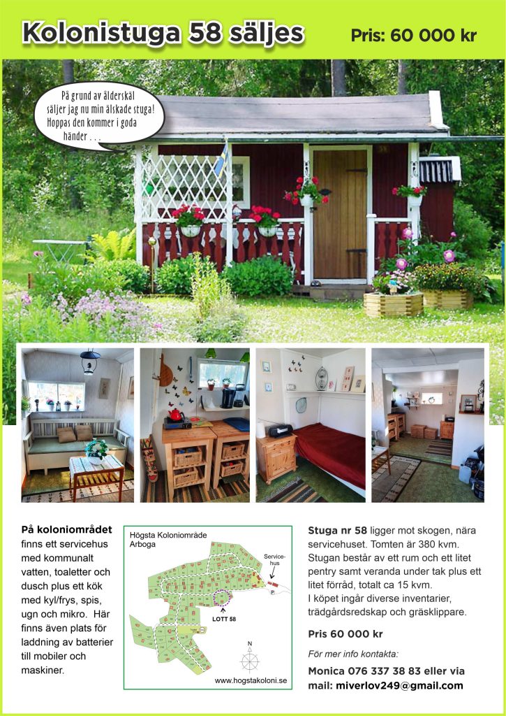 Funderar du på att sälja? Tänk på att du först måste meddela styrelsen som informerar vilka regler som gäller vid försäljning av kolonistuga. Därefter kan du få hjälpa med fotografering och framtagning av en annons. Annonsen visas först för våra kömedlemmar och en vecka senare publiceras annonsen på föreningens hemsida och på koloniområdets anslagstavla.